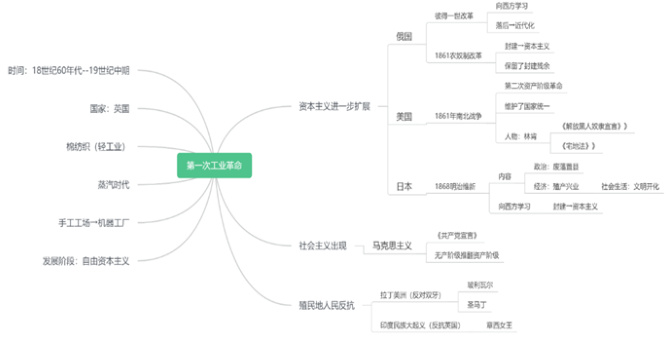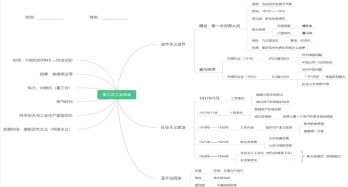 案例 2 说明:在学习两次工业革命及两次世界大战这些重要知识点前,我首先对这些重大事件的相互联系进行了梳理,围绕资本主义的进一步发展提前设计了以上思维导图,在给学生授课时带着学生一边学习梳理,帮助学生理解以上重大事件联系。如在讲第一次工业革命时,分析背景回顾资本主义制度初步建立推动工业革命的开展。通过工业革命后,社会生产力大大提高,分别以美国的独立战争,日本的明治维新,俄国的农奴制改革三大事件表明资本主义的得到进一步巩固与发展,为第二次工业革命的开展奠定了基础,结合以上建构出图 2 思维导图。通过第二次工业革命的,社会生产力进一步提高,自由资本主义过渡到垄断资本主义,但主要资本资本主义国家呈现出政治经济发展不平衡的现象,成为一战爆发的根本原因。然而一战后的建立的凡尔赛华盛顿体系国际新秩序并未能解决帝国主义国家政治经济发展不平衡的问题,最终第二次世界大战,构建图 3 思维导图。通过以上两个思维导图的构建,帮助学生掌握了这些事件间的联系。