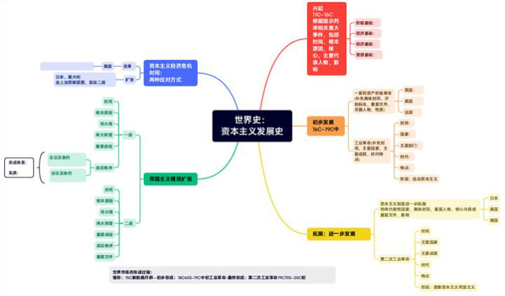 在世界近代史中主线索是十分清晰的,课本内容主要是围绕资本主义发展史,社会主义发展史,民族独立解放战争几条主线展开。考虑到学生的历史思维能力有所欠缺,我在实施思维导图时,将其分为三个步骤:首先是确定主线索,接着分化成一个个小网格,最后进行整合总结巩固。现在,我将以九年级世界史中资本主义发展历史为例,分享我对于思维导图在历史教学中的应用的一些具体做法。在进行教学前,我围绕“世界资本主义发展过程”,独立地创建关于“资本的产生”至"资本主义初步发展“到“资本主义进一步拓展”的相关思维导图,以时间为脉络,环环相扣,最后整合,形成一张大的知识网络。以下是我在教学实践中的应用案例分享: