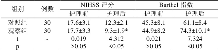 护理前,两组 NIHSS 评分和 Barthel 指数比较,差异无统计学意义( P>0.05 );护理后,观察组 NIHSS 评分低于对照组,Barthel 指数高于对照组,差异均有统计学意义( P<0.05 )。见表 1。