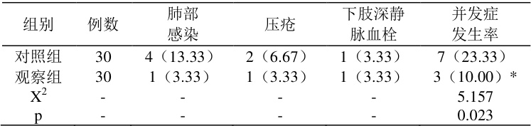 观察组并发症发生率为 10.00% (3/30),低于对照组的 23.33% (7/30),差异有统计学意义( x2=5.157 , P=0.023 )。见表 2。