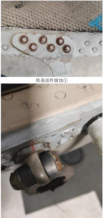 (1)铁基部件腐蚀。螺钉、垫片等仅喷涂表面漆层的部件,因漆层破损或工艺缺陷,容易吸附水汽形成棕色铁锈,Fe₂O₃.H₂O,此类腐蚀具有明显外观特征,如果尚未及时处理,锈蚀会向基材深层扩散,导致结构强度下降。