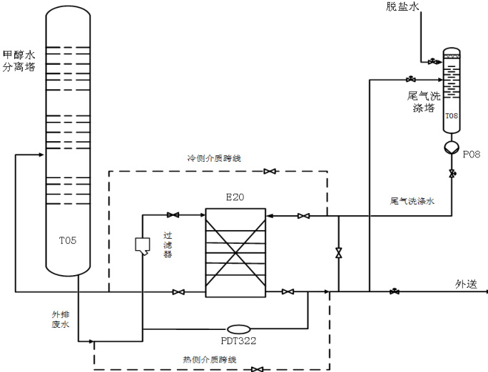 该废水换热器 E20 的流程简图如下图;其热侧介质为 130∘C 的外排废水,冷侧介质为 20℃的尾气洗涤水。