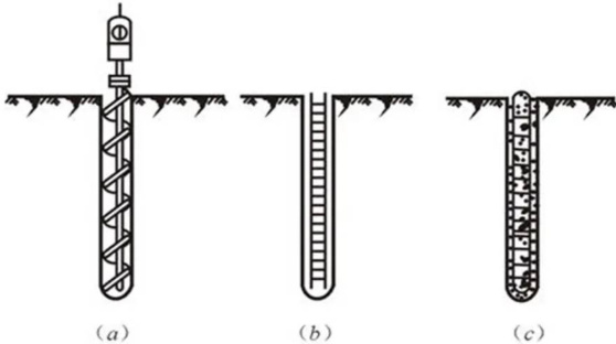 图1 螺旋钻孔灌注桩施工示意图a-钻孔;b-放置钢筋骨架;c-浇筑混凝土