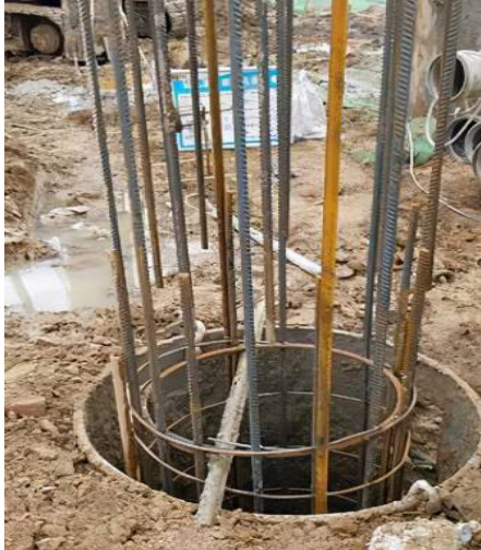 钢筋笼的制作及安装是 的承载能力和整体结构的稳定性。在制 确保其强度和韧性满足施工需求。钢筋 ,以确保各个连接点的牢固性和整体 心放入已埋设好的护筒内,并确保其垂直度和 工人员应采取适当的支撑措施,确保其稳 无锈蚀现象,且与孔壁之间的间隙符合设计规范。 的承载能力,还能有效提升工程的整体安全性,为后续的混凝 图3 为钢筋笼安装现场图。