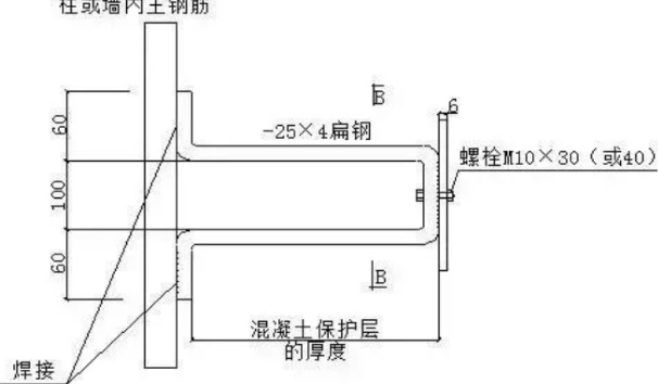 在具体施工过程中,施工人员需严格遵循操作规程,确保接地电极的埋设深度和位置符合设计要求,以提高接地效果。同时,接地线的连接应采用可靠的焊接或螺 接方式 ,确保连接的牢固性和安全性。如图 3 所示为接地预埋连接板安装示意图。此外,施工完成后,应对防雷接地系统进行全面测试,以验证其有效性和可靠性,从而确保电气系统在遭遇雷电天气时能够安全运行。