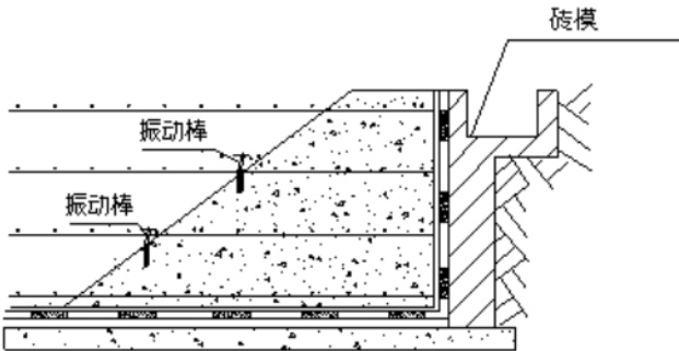 混凝土的浇筑与养护是后浇带施工中至关重要的环节,直接关系到后浇带的强度和耐久性。首先,在浇筑过程中,需确保混凝土的配合比符合设计要求,并在规定时间内完成浇筑,以避免混凝土的初凝和终凝影响施工质量。浇筑时应采取分层浇筑的方法,避免大面积一次性浇筑引起的混凝土离析及气泡现象。同时,应使用振动器等工具对混凝土进行充分振捣,以提高其密实度,确保混凝土充分填充模板,消除空隙,如图 2 所示为振捣方式示意图。混凝土浇筑完成后,养护工作同样不可忽视。适当的养护能够有效防止混凝土表面干裂和强度不足。养护期间,应保持混凝土表面湿润,采用洒水、覆盖湿麻袋或塑料膜等方式进行保湿,确保混凝土在硬化过程中得到足够的水分。此外,根据气候条件,养护时间一般需持续 7 天以上,以达到最佳的强度和耐久性。