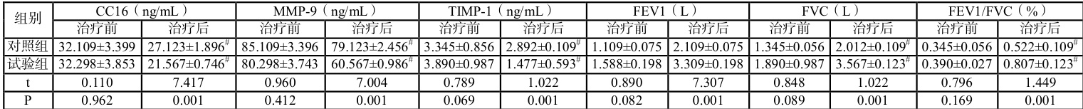 试验组治疗有效率高于对照组( P<0.05 );试验组不良反应发生率较之对照组,差异不显著( P>0.05 ),说明联合治疗的临床效果相对更好,且能够保证患者的安全。上述研究结果的产生主要归因于新型长效扩张剂与个性化康复护理的协同作用机制。新型长效扩张剂通过持续作用于气道平滑肌,松弛气道、减少气流阻塞,直接改善FEV1、FVC等肺功能指标;同时抑制炎症介质释放,降低MMP-9 的表达,调节MMP-9/TIMP-1 失衡状态,延缓气道重塑进程,进而改善CC16 等炎症相关生物标志物水平。个性化康复护理则从运动训练、呼吸功能锻炼、营养支持等多维度提升患者机体耐力与呼吸效率,促进其多症状的改善,加速其病情缓解。