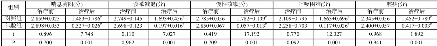 CC16、MMP-9、TIMP-1、FEV1、FVC、FEV1/FVC等指标的对比,试验组有显著改善( P<0.05 ),检测血清或痰液中 MMP-9/TIMP-1 的比值,可反映 COPD 患者气道重塑的程度,对评估病情进展和治疗效果具有一定的参考价值,能够看出新型长效扩张剂+个性化康复护理可改善患者的生物标志物指标与肺功能;试验组患者咳嗽、咳痰、呼吸困难等症状评分明显低于对照组( P<0.05 ),提示新型长效扩张剂+个性化康复护理能够促进患者喘息胸闷、食欲食欲减退、慢性咳嗽、呼吸困难、咳痰的改善;