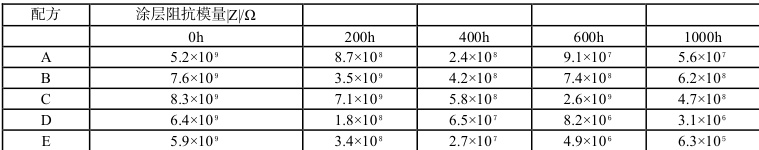 为评估自修复智能防腐涂料的耐腐蚀性能,设计了5 种材料配方(A\~E),制备试样进行盐雾加速腐蚀试验,周期为1000h,每隔200h 测试涂层阻抗模量变化,结果见表 1 配方B 和C 涂层阻抗模量始终保持在10₁Ω 以上,表现出优异的耐腐蚀性,其中配方 C 性能最佳。传统环氧涂料随腐蚀时间延长阻抗逐渐下降,说明其屏蔽性能逐渐丧失。而自修复涂料在 1000h 后仍能维持较高的阻抗值,得益于微胶囊及时修复了涂层开裂,阻断了腐蚀通道。