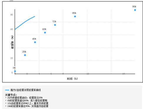 通过单轴拉伸试验和光学显微镜观察相结合的方法,定量评估了自修复防腐涂层的修复效率。将涂层试样拉伸至1%应变后卸载,不同时间间隔后 裂纹宽度变化,计算修复率。典型配方C 的修复率-时间曲线如图1所示。涂层的修复率随时间增加而提高,12h 后修复率达 85%lLLL ,24h 时接近 95% ,表现出快速自修复能力。微胶囊封装的环氧树脂能有效润湿基体裂纹,并在常温常湿下固化,实现高效修复。