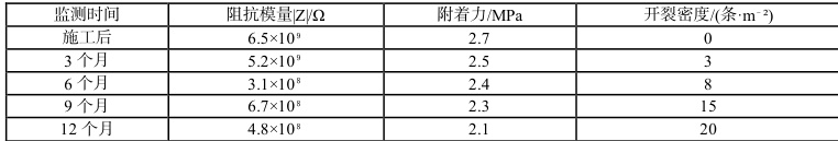 对试验段防撞墙涂层的耐久性能进行了为期12 个月的跟踪监测,每3 个月测试涂层阻抗、附着力、开裂密度等性能指标,结果见表2。涂层阻抗始终维持在10₁Ω 量级,表明其防腐屏蔽作用稳定;附着力保持在2MPa以上,足以抵抗外界冲击、磨损;开裂密度始终低于对比段,证实了涂层在实际环境中的自修复效应。已有监测数据表明,自修复智能防腐涂层在高速公路实际环境中能发挥稳定的防腐效果,延长了防撞墙的使用寿命。