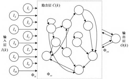 (Ik)表示故障检测回声状态网络的输入,C(k)表示故障检测回声状态网络中间层神经元,O(k)表示故障检测回声状态网络的输出,l、m、n 分别表示的是故障检测回声状态网络各层次神经元数量,k 表示采样值。
