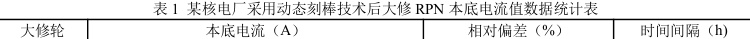 某核电厂启动物理试验RPN 本底电流值统计结果如下表1 所示,可以看到达临界提棒前的 RPN 本底电流与动态刻棒正式实施的RPN 本底电流相对偏差最大为 0.58% ,RPN 本底电流值变化很小。