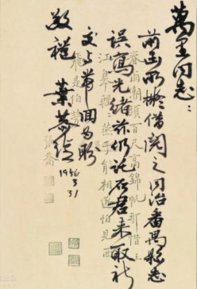 万里同志:前函所拟借阅之《同治番禺县志》,误写光绪,兹仍讬石君来取,祈交与带回为盼。敬礼!叶恭绰 1956年3月31日