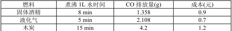 学生自制固体酒精(醋酸钙+乙醇溶液凝胶化),测试燃烧效果,分析不同燃料煮火锅的CO排放差异(表3):