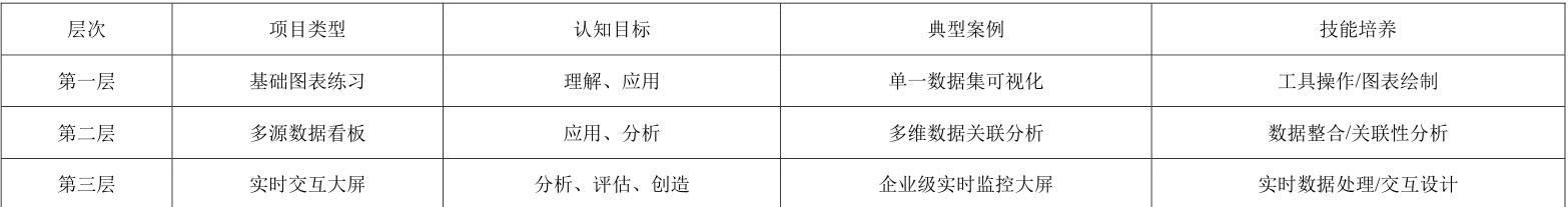 课程基于 Bloom 认知分类法,设计三级递进项目库(表1),重点培养学生从数据中提炼信息、构建叙事逻辑的能力。