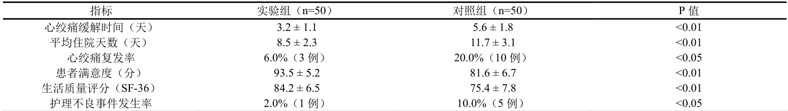 本研究共纳入100 例心内科冠心病心绞痛患者,其中实验组50 例接受精细化护理干预,对照组50 例接受常规护理。通过对两组患者的护理效果进行比较分析,结果显示精细化护理在改善临床症状、缩短住院时间、降低复发率及提高患者满意度等方面具有显著优势。