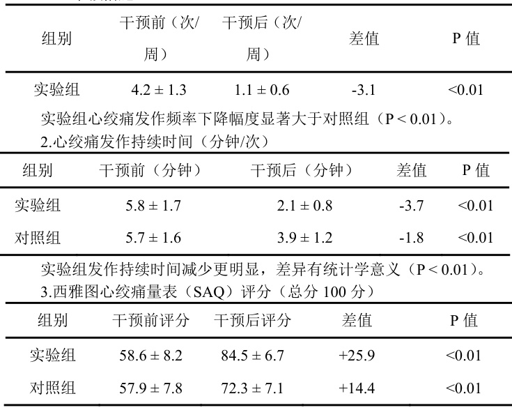 本研究通过为期一年的随机对照试验,探讨了基于前馈控制的康复护理干预对心绞痛患者的临床疗效。结果显示,与常规护理相比,实验组在接受了基于前馈控制的康复护理后,在心绞痛发作频率、持续时间、生活质量、心理健康状态及服药依从性等方面均有显著改善,且不良事件发生率明显降低,说明该干预模式在慢性心血管疾病管理中具有良好的应用价值。