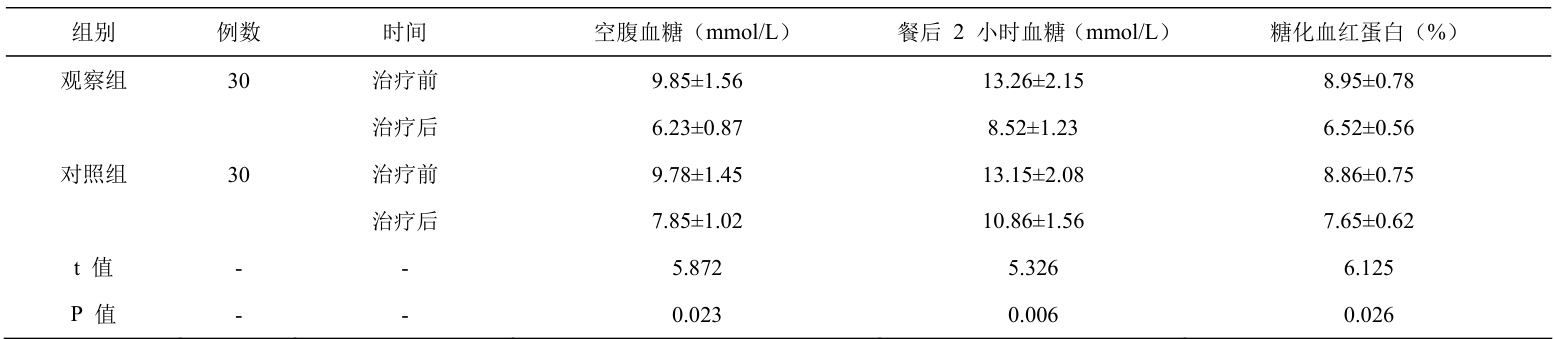 对比两组患者治疗前后血糖指标,指标涉及空腹血糖、餐后 2 小时血糖、糖化血红蛋白。