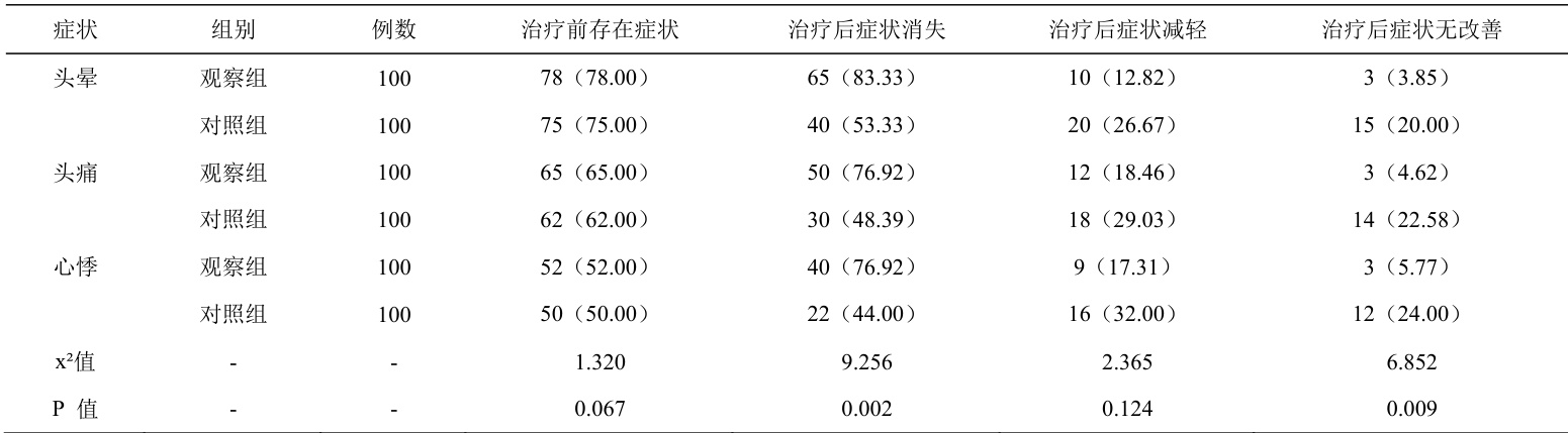 对比两组患者治疗前后头晕、头痛、心悸等高血压症状改善情况。