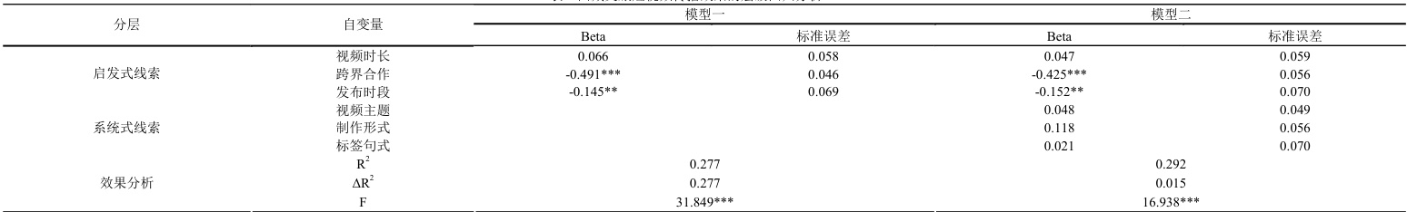 为验证启发式线索与系统式线索对传播效果的相对影响力(假设 H7),本研究采用层级回归法进行分层检验,具体步骤如下:首先将启发式线索变量纳入回归模型,得到模型 1,在模型 1 基础上加入系统式线索变量,形成模型 2。层级回归结果(表 1)凸显传播机制的本质矛盾:启发式线索主导初期流量分配,共同解释 27.7%的传播效果变异(ΔR²=0.277, F=31.849*),系统式线索的增效空间受限:加入视频主题、制作形式、标题句式后,模型解释力仅微增 1.5% ( ΔR2=0.015) ,这验证了假设 H7——在碎片化传播场景下,启发式线索的初期解释力显著高于系统式线索,因此假设 7 成立。