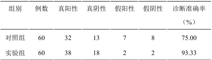 实验组诊断灵敏度为 91.67% 、特异度为 95.00% ,均高于对照组的70.00% 、 80.00% ( P<0.05) ),差异具有统计学意义。
