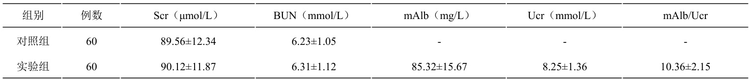生化指标水平:比较两组 Scr、BUN、mAlb、Ucr 及 mAlb/Ucr 水平。