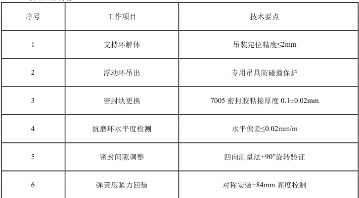 水轮发电机组主轴密封承担着阻断水流沿主轴间隙渗入机坑的关键功能。据统计,密封失效导致的非计划停机占水电机组故障的 23%以上(中国水力发电工程学会,2023)。老挝某水电站 1 号机组在运行中检测到密封块磨损量超限(达 1.8mm,超过设计允许值 0.5mm) ),需在 C 修期间实施密封系统整体更换。本次检修涵盖支持环解体、浮动环吊装、密封块粘接、抗磨环调平等 12 项核心工序,具有工艺复杂、精度要求高(间隙控制 ⩽0.2mm⟩ )、安全风险大等特点。