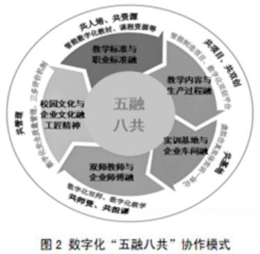 以数字化“五融八共”协作模式,促产业资源融入人才培养。如图2所示,构建了“五融八共”协作模式,以企业为主导地位,教学标准与职业标准相融合(共同制定智能数字化人才培养方案、共同开发智能化数字化资源库):共同开发了课程标准,共同建设专业课程和教学资源库,共同编写了融入行业标准的数字化教材。教学内容与生产过程融合(共同开发智能制造项目、共同开展双创教育项目):共建了企业服务中心、双创数字化平台等。实训基地与企业车间相融合(共建共享虚实一体化实习实训基地):共同建设10条生产线(河南食品加工中试基地),4个生产性实训基地、2个校内工厂车间、1个河南省示范性虚拟仿真实训基地等。双师教师与企业师傅相融合(共同建设数字化师资队伍、共同承担课程教学任务):校企建立“双向互动,互兼互聘,轮岗锻炼”的人才交流机制,实现数字化师资共享。校园文化与企业文化相融合(共建安全质量管理机制):智能制造学院根据企业人才培养需求开展相应活动,融入企业文化、培养工匠精神、进行精细管理,从而实现与教育相关的企业化过程管理。