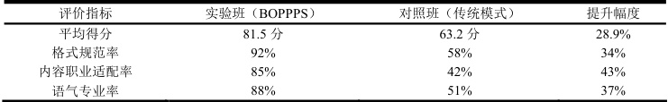 1. 成绩对比:学期末对两个班进行“职场文书写作测试”(任务为“为校企合作企业撰写一封合作方案邮件”),实验班平均分为 81.5 分,对照班平均分为 63.2AA ,且实验班“格式规范率” (92% vs 58%)、“内容职业适配率”(85% vs 42%)均显著高于对照班(见下表)。