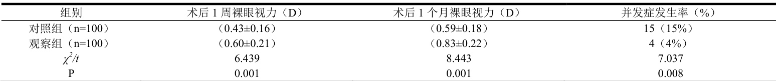 结合表 1 数据结果得知,观察组患者术后各阶段裸眼视力改善效果均优于对照组患者,且术后并发症发生率总和更低( ⋅P<0.05⟩ ),组间有统计学意义。