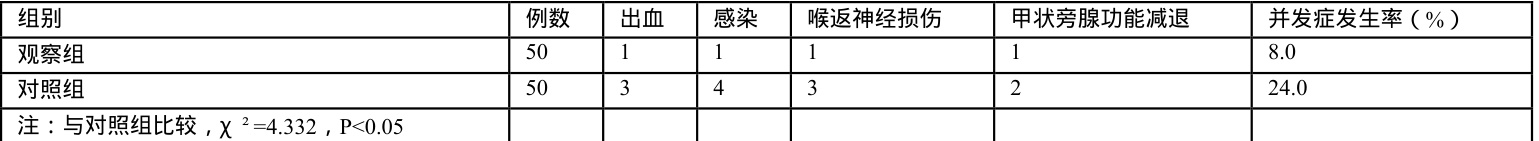 观察并记录两组患者术后并发症发生率,包括出血、感染、喉返神经损伤、甲状旁腺功能减退等;统计两组患者的住院时间;采用我院自制的满意度调查问卷对患者进行满意度调查,分为非常满意、满意、不满意三个等级,满意度 Σ=Σ (非常满意例数 + 满意例数)/ 总例数 ×100‰ 。