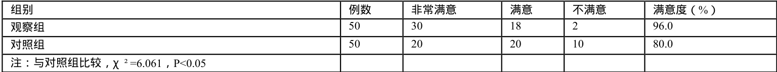 观察组患者满意度为 96.0% (48/50),显著高于对照组的 80.0% (40/50),差异有统计学意义( P<0.05 ),见表 2
