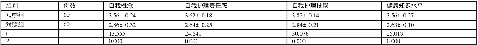 (1)将两组患者的自我护理能力评分进行对比:采用ESCA 量表评估:自我概念、自我护理责任感、自我护理技能、健康知识水平,0 至 4 分,分数越高自我护理能力越强。
