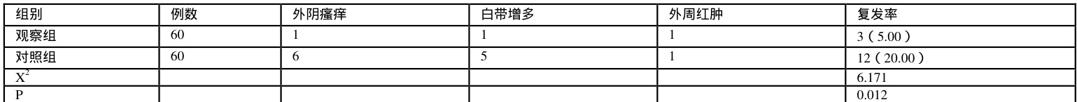 (3)对比两组的病症复发率:外阴瘙痒、白带增多、外周红肿。
