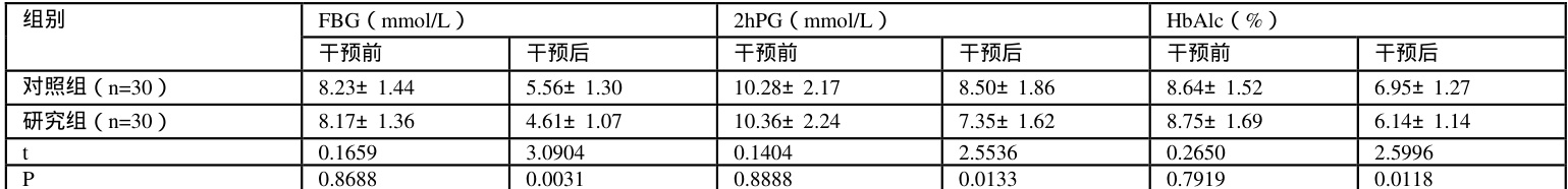 干预后,研究组血糖水平均较低, P<0.05 。详见表1.
