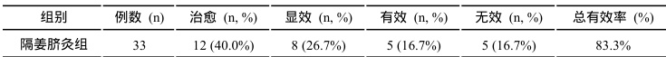 对 33 例小儿肾气不足型遗尿症患儿进行隔姜脐灸治疗后,疗效统计结果如下:表 1. 隔姜脐灸治疗小儿遗尿症的疗效统计