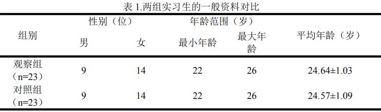 将我院于 03 年 3 月至 05 年 1 月的 46 位胃肠外科实习生,随机分为观察组、对照组,各3 位。两组实习生临床资料如表1 所示: