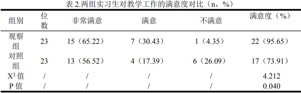 在实习生对教学工作的满意度方面,观察组为 95.65% (/3),对照组为 73.91%(17/3),观察组明显高于对照组,有统计学意义, P<0.05 ;见表 2.