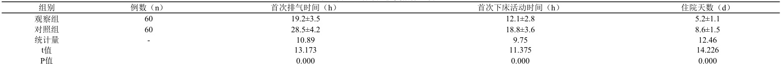 研究发现,观察组的首次排气时间以及首次下床活动时间都比对照组短,并且在住院天数方面,观察组也是明显少于对照组,两组之间的差异显著( ⋅P<0.001) ,具备统计学意义上的意义。