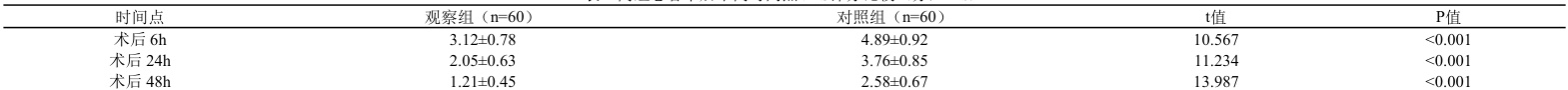 结果显示,观察组在术后6小时、24小时以及48小时时的VAS评分都明显比对照组要低,并且这种差异还具备统计学层面的意义(P<0.001)(具体可参照表2)。