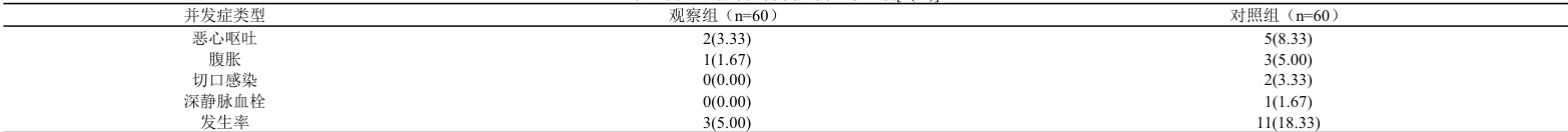 (3)并发症发生率:对于并发症发生率的统计,要统计术后7 天以内恶心呕吐、腹胀、切口感染以及深静脉血栓的发生状况。
