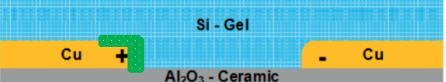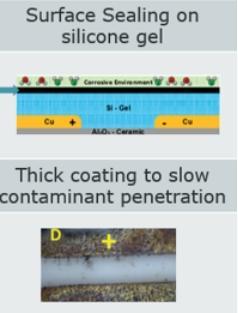 基于以上实验,将灌胶的胶水的型号进行了定义,新的灌胶工艺流程已经对灌胶的烘烤的条件和设备抽真空的参数进行了定义,后续生产的灌胶产品没有了气泡,保证了灌胶后产品的可靠性。在使用 IGBT 日本信越 M-1 的防硫化胶水进行涂层,150 度 1 小时固化后,进行温度 85 度湿度 85 H2S 气体浓度 50PPM 的 720 小时测试,最后测试的通电,满足可靠性性能,绝缘测试,相关测试,产品的DBC 铜层没有生长出晶分支。保证了产品通过硅凝胶后的良好的可靠性能。在硅凝胶上喷涂一层防硫化胶。如图 10 和 11。