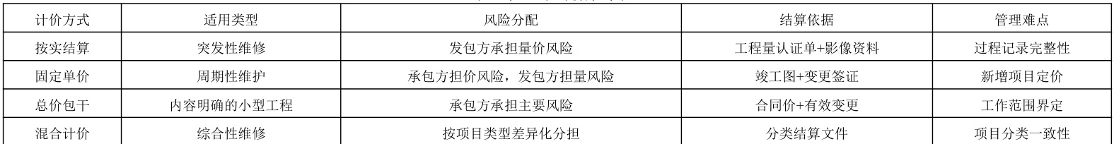 该模式把实际完成的工程量当作计价依据,适合于突发性维修、不可预见工程等难以事先判定工作量的项目,其核心要求为施工时对人工、材料、机械消耗进行详细记录,产生双方达成一致的工程量认证凭据、验收记录及影像档案,优势为灵活性十分显著,可适应工程所面临的不确定性,只是对过程记录的完整性依赖极高,主要的量价风险落到发包方头上,管理的难点聚焦于保障过程资料准确且及时。