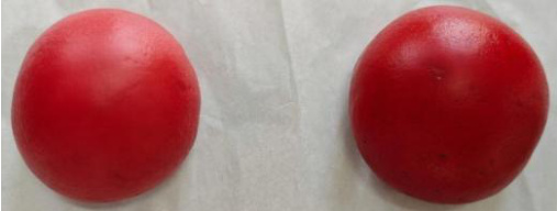 除了甜菜根之外,红曲粉也是调制红色面团的一个优良选择,甜菜根制作出来的面团为略带紫调的红色,而红曲粉制作出来的面团为偏暗的红色。以下为实验结果,如图:左边为甜菜根泥调制的面团,右边为红曲粉调制的面团。