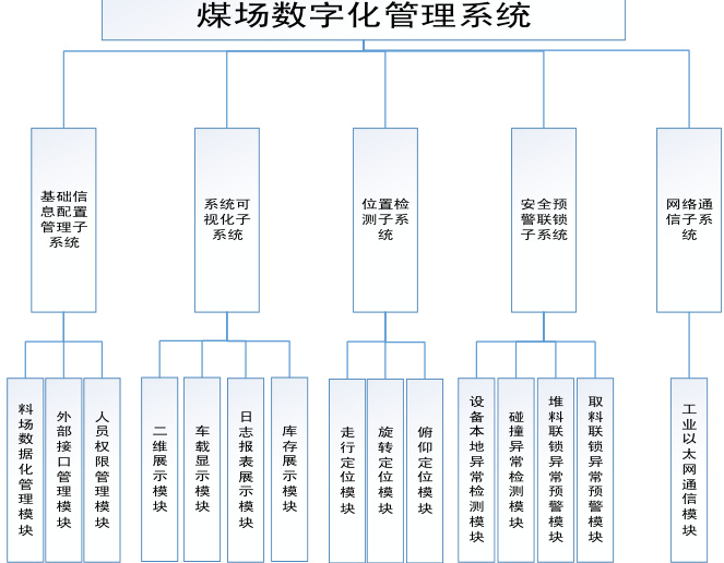涟钢信息化数字化煤场研究项目为保证系统整体的鲁棒性、可用性和强适应性。系统按照高内聚低耦合的设计思想,将按完成的功能模块划分为 5 个子系统:基础信息配置管理子系统、系统可视化子系统、位置检测子系统、安全预警联锁子系统、网络通信子系统。各个子系统又划分为多个功能实现模块,各模块和子系统相互配合,共同构建完善的堆取料机集中管控平台。