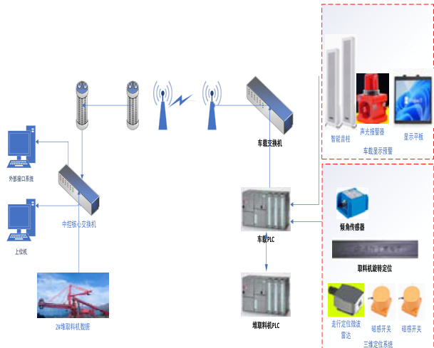 PLC 控制系统连接至交换机。机尾地面与堆取料机上装有无线 AP,无线 AP 接至交换机,实现车上车下数据联通。