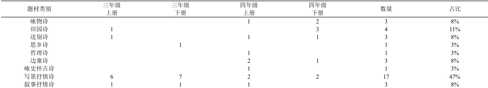 表 2.1 数据显示,小学三四年级语文教材中,写景抒情诗占一半,其他类型诗如叙事抒情、咏物、田园、送别和边塞诗各占约 10% ,而思乡、哲理和咏史怀古诗较少。选文符合小学生认知发展,三年级学生通过写景抒情诗学习具体景象,四年级开始接触更多逻辑性题材,提升学习层次。
