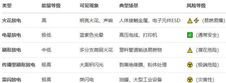 (4)传播型刷形放电,高电荷密度绝缘体(如薄膜、涂层)表面发生的大面积快速放电,能量极高。其特点是高危险性,可释放数焦耳能量,足以点燃爆炸性环境;快速传播,放电沿表面扩展。如撕开大型塑料膜或剥离绝缘涂层时、化工设备中绝缘材料积累静电后的突发放电。