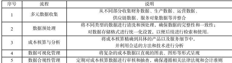 在现代化社会,企业经营与发展会产生大量的核算信息数据,这是因为企业在进行会计成本核算时,接触的核算对象更加丰富。除了采购部门、生产部门之外,还包括技术研发部门等。为了提升核算数据收集的全面性和企业成本核算管理的有效性,企业需要摆脱传统的成本信息整合与管理模式,针对数据整合与管理设置精细化的流程(见表2)。
